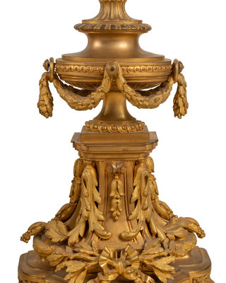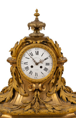 Height of mantel clock 27 1/4 x width 28 1/4 inches; height of candelabra 36 inches.