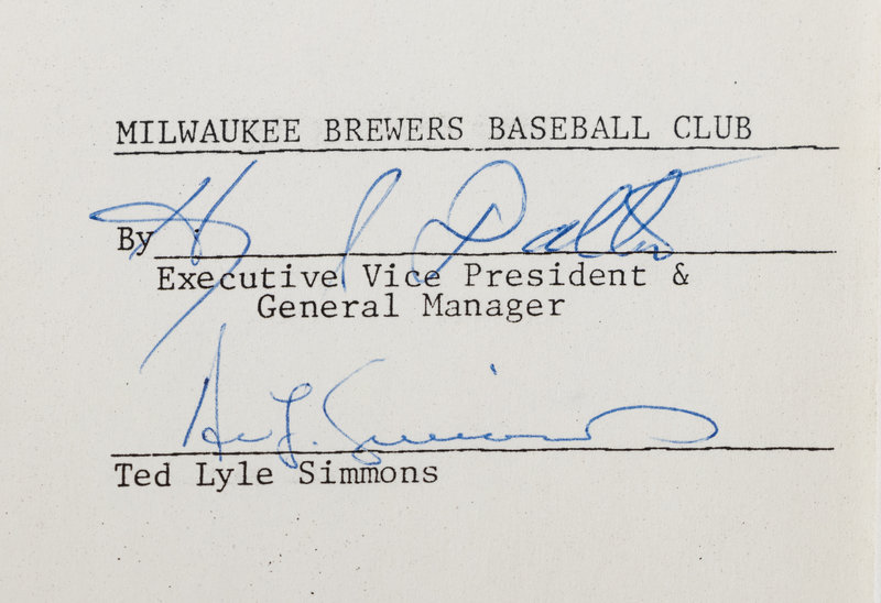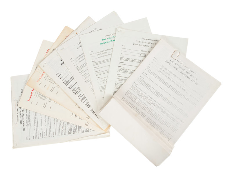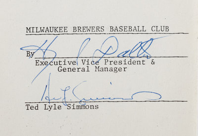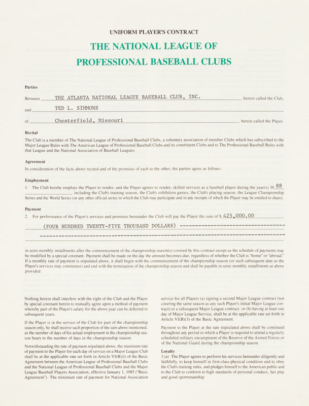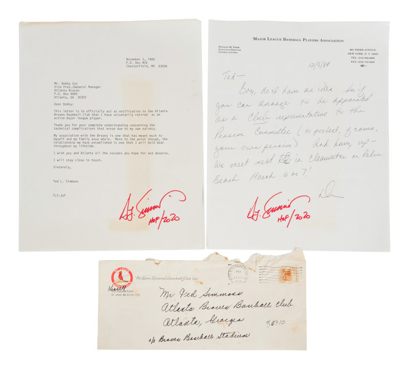 comprising a 1971 St. Louis Cardinals Uniform Player's Contract (Simmons' copy); a 1972 St. Louis Cardinals Uniform Players Contract (Simmons' copy); a 1975 St. Louis Cardinals Uniform Player's Contract (Simmons' copy); a 1979-83 St. Louis Cardinals' Uniform Player's Contract (Simmons' copy); a 1981-83 Milwaukee Brewers Uniform Player's Contract (Simmons' copy); a 1984-87 Milwaukee Brewers Uniform Player's Contract (Simmons' copy); a 1987 Atlanta Braves Uniform Player's Contract (Simmons' copy); a 1988 Atlanta Braves Uniform Player's Contract (Simmons' copy); a November 3, 1988 letter addressed to Atlanta Braves VP/General Manager Bobby Cox officially notifying the Braves Simmons' retirement as an active Major League Baseball player (Simmons' post-signed copy); a September 1988 letter from St. Louis Cardinals coach George Kissell suggesting Simmons connect with General Manager Dal Maxvill to rejoin the Cardinals as instructor/coach (post-signed by Simmons); a December 1988 letter from MLBPA Executive Director Donald M. Fehr suggested Simmons be appointed as a club representative to baseball's Pension Committee (post-signed by Simmons);