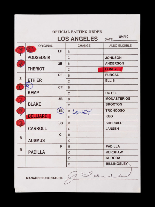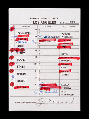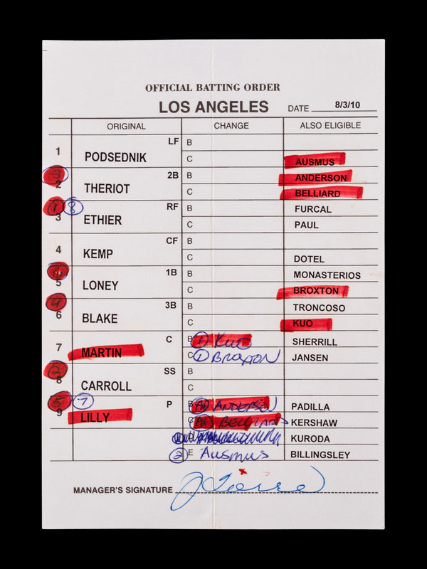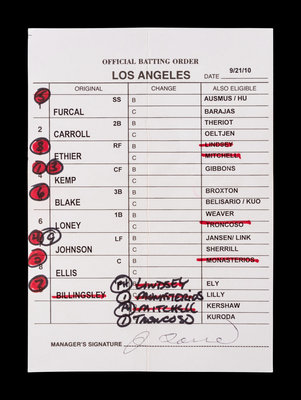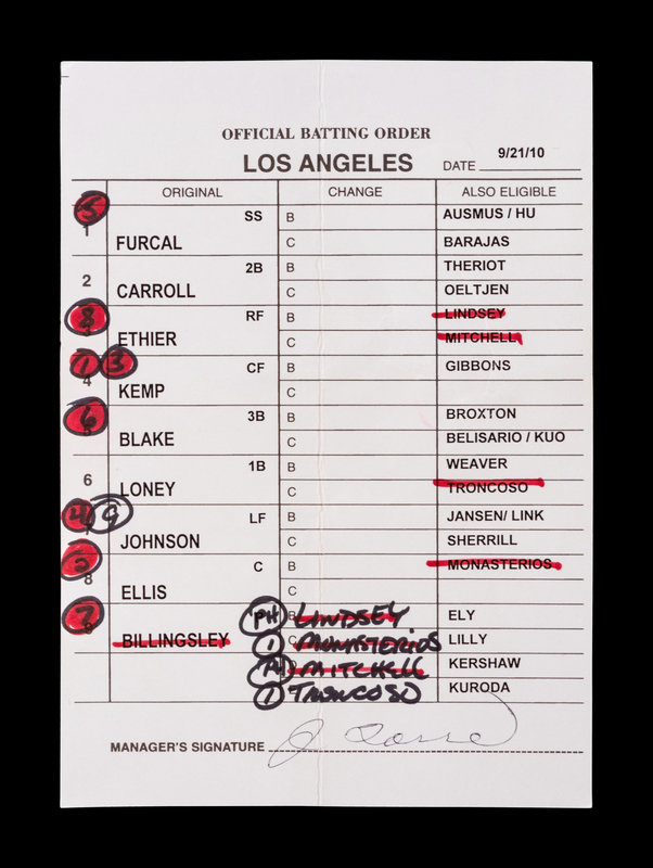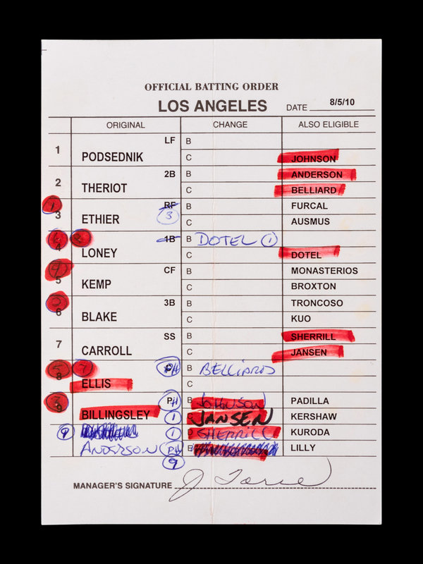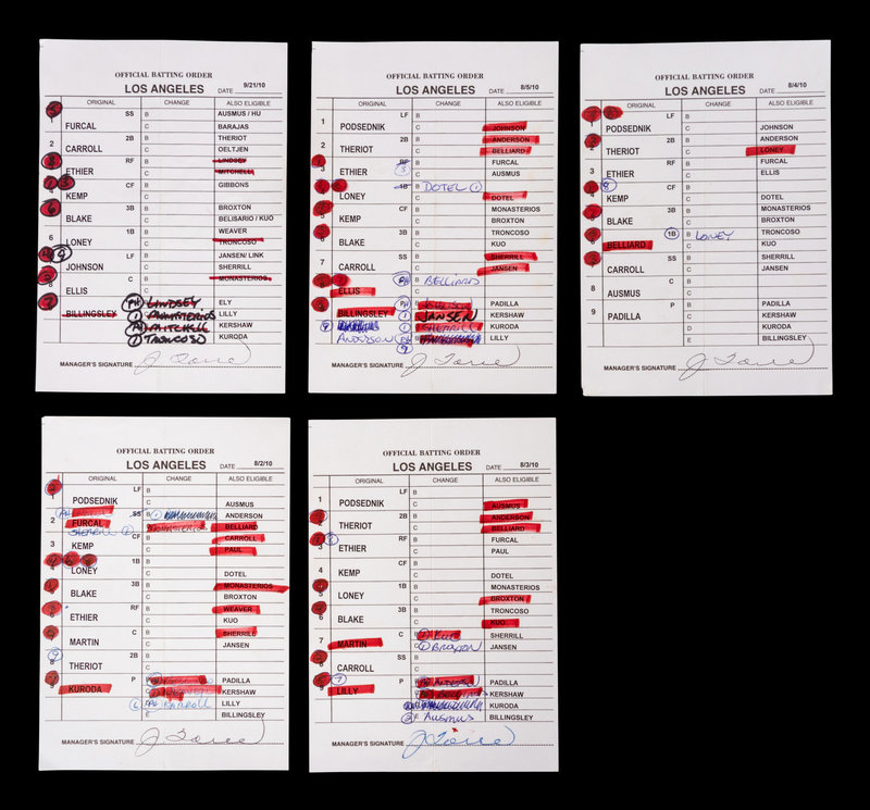 A Group of Five 2010 Joe Torre Signed Autograph Los Angeles Dodgers Umpire Lineup Cards from The Collection of Baseball Hall of Famer Ted Simmons,