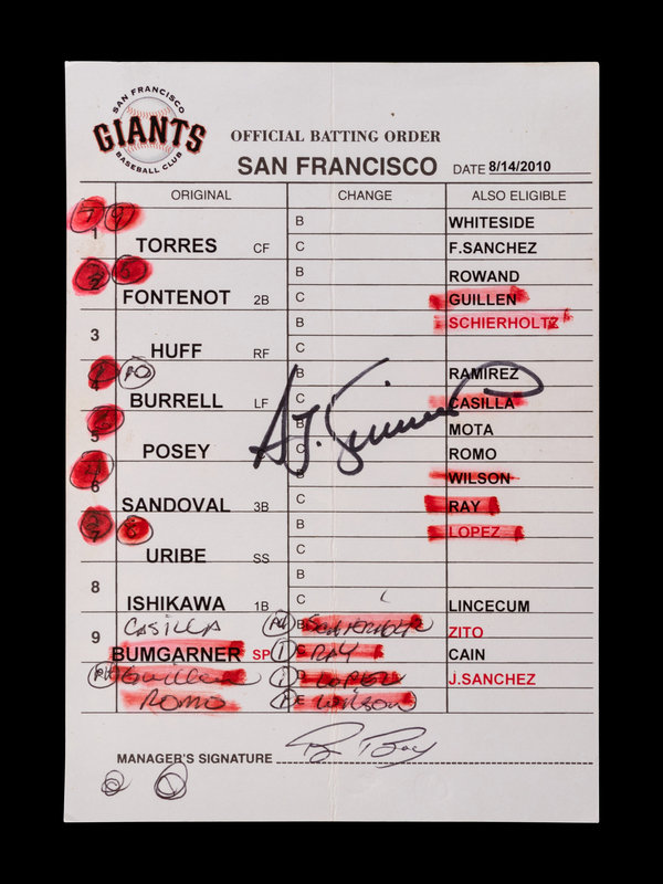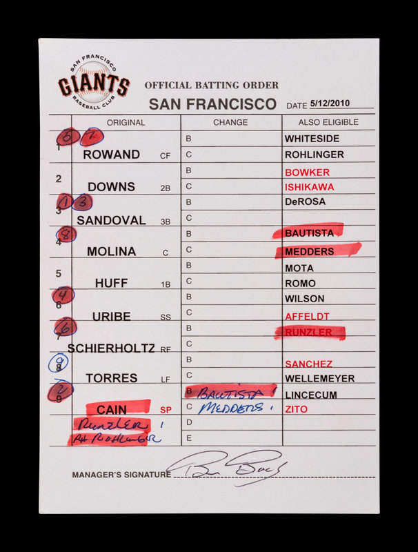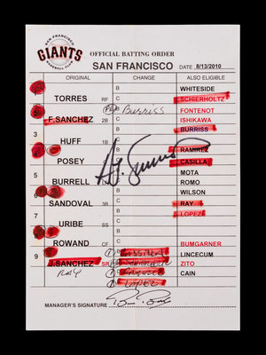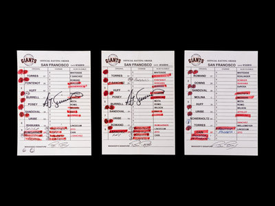 A Group of Three 2010 World Series Champion San Francisco Giants Umpire Lineup Cards from The Collection of Baseball Hall of Famer Ted Simmons,