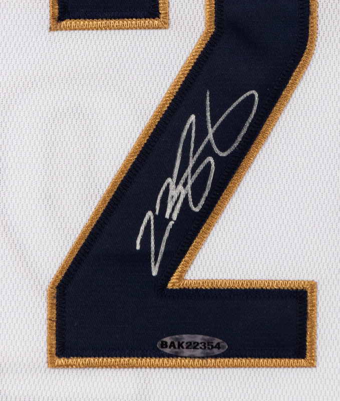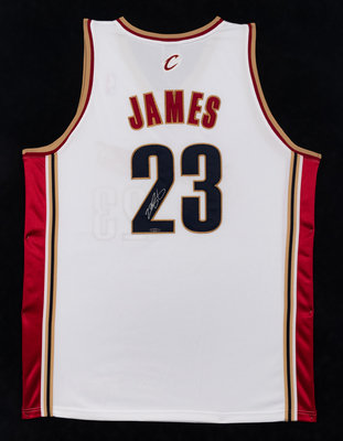 inscribed "Lebron James" in silver ink inside number two on back of jersey.