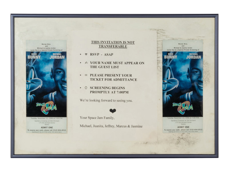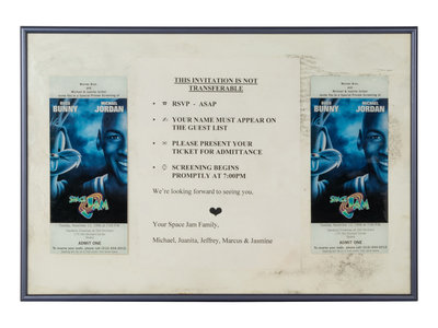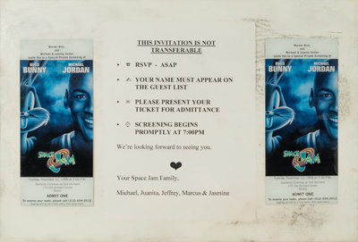Invitation display features two tickets to November 12, 1996 Space Jam premiere at Gardens Cinemas, Old Orchard Center, Skokie with invitation note stating "We're looking forward to seeing you. Your Space Jam Family, Michael, Juanita, Jeffrey, Marcus & Jasmine"