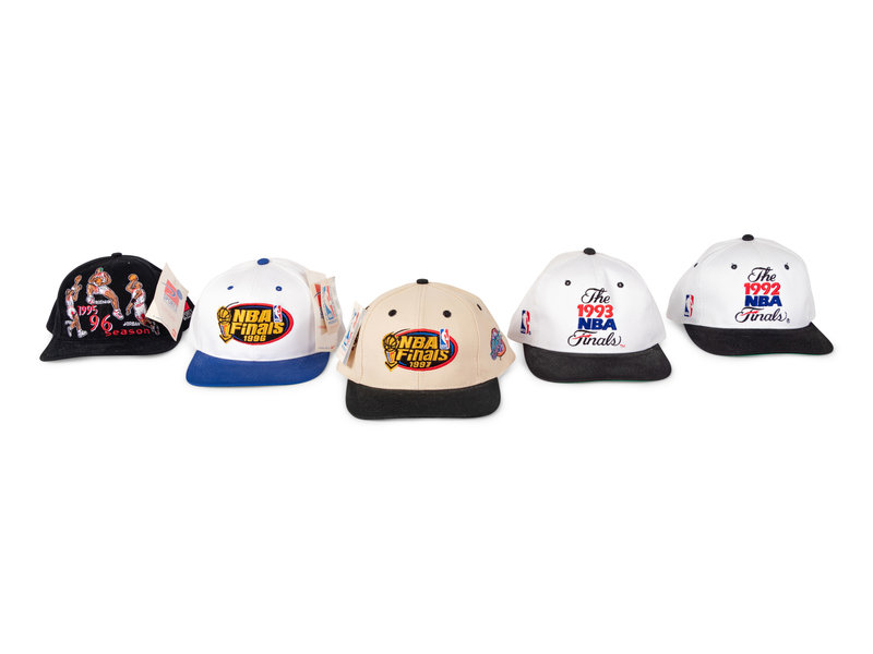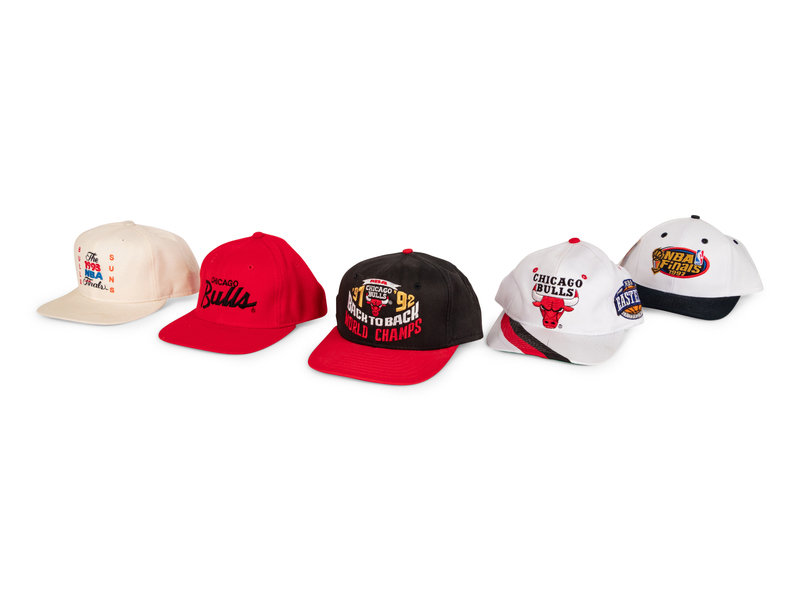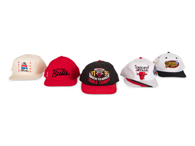 comprising vintage Sports Specialities Chicago Bulls Script hat, 1991-1992 Back To Back World Champs, 1992 NBA Finals, 1993 NBA Finals, 1993 NBA Finals Bulls Suns, 1995-96 Jordan, Pippen, Rodman Big 3, 1996 NBA Finals, 1997 NBA Finals x2, Chicago Bulls Eastern Conference.