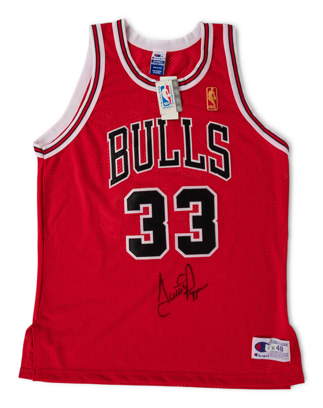 A Scottie Pippen Signed Autograph Chicago Bulls Champion NBA 50 Basketball Jersey (Beckett Authentication Services BAS Certified),