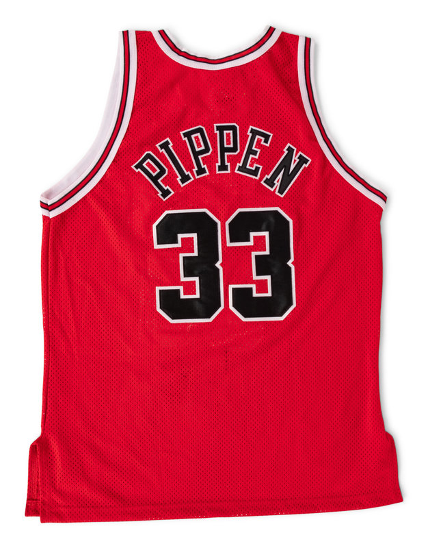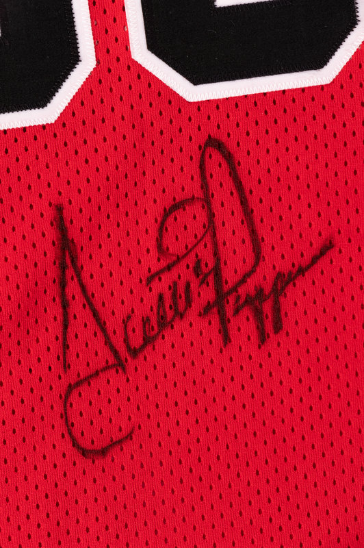 boldly inscribed "Scottie Pippen" in black Sharpie on front of jersey.