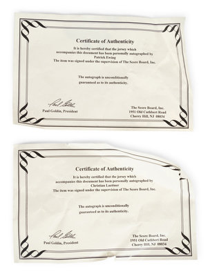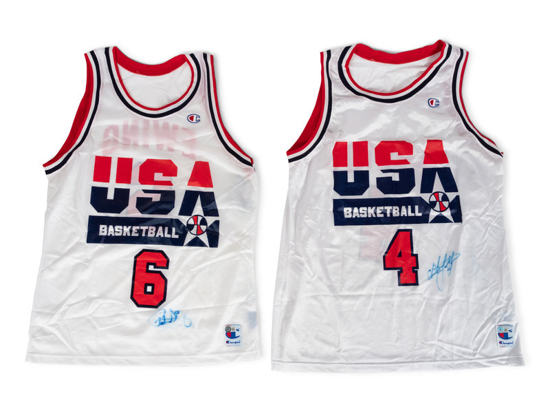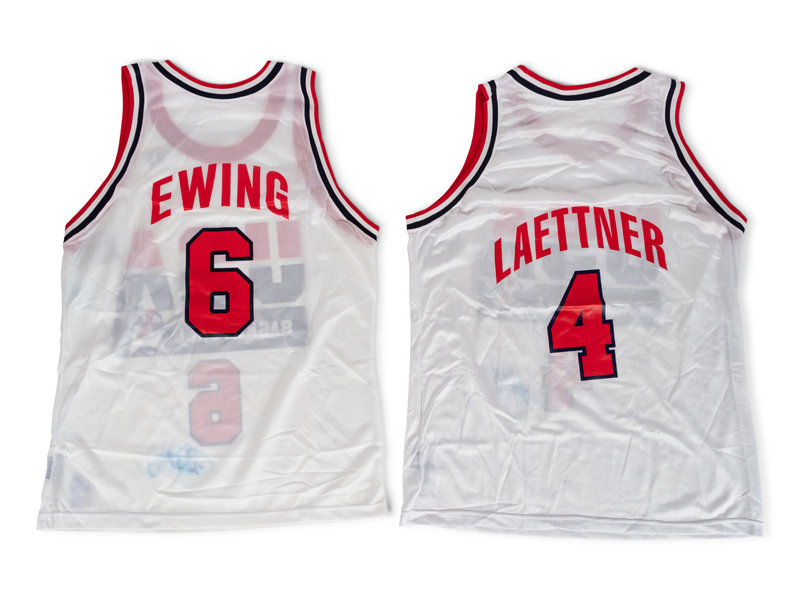 A Group of Two 1992 USA Olympic Basketball (Dream Team) Signed Basketball Jerseys Including Patrick Ewing (Beckett Authentication Services BAS Certified),