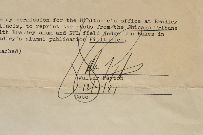 granting Bradley University permission to use likeness in alumni publication. Signed and dated by Payton in black ink.