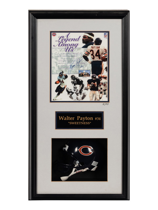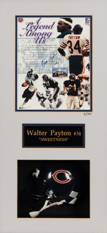 comprising of "Legend Among Us" print inscribed "Walter Payton 34" in blue Sharpie and an unsigned Chicago Bears mini helmet. Numbered 8/34.