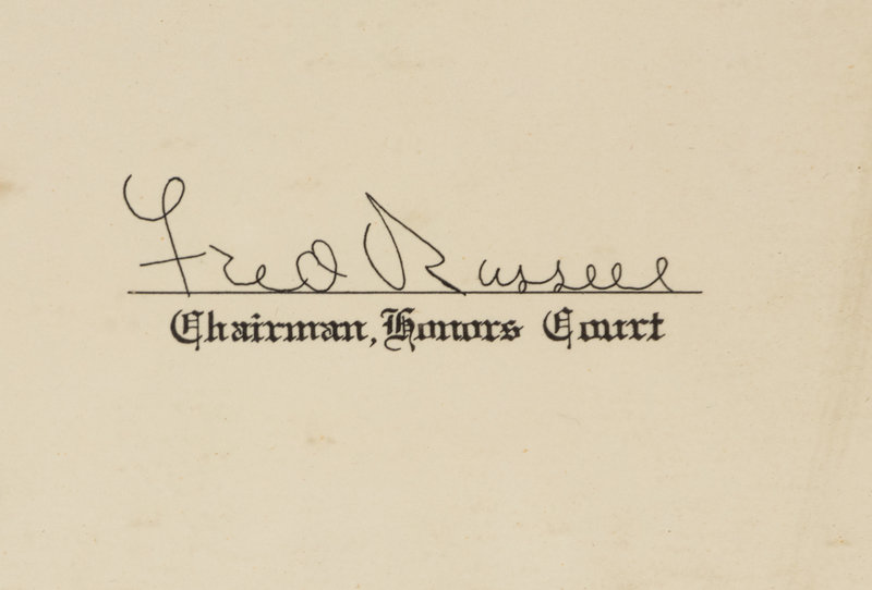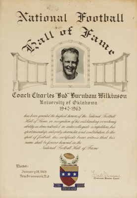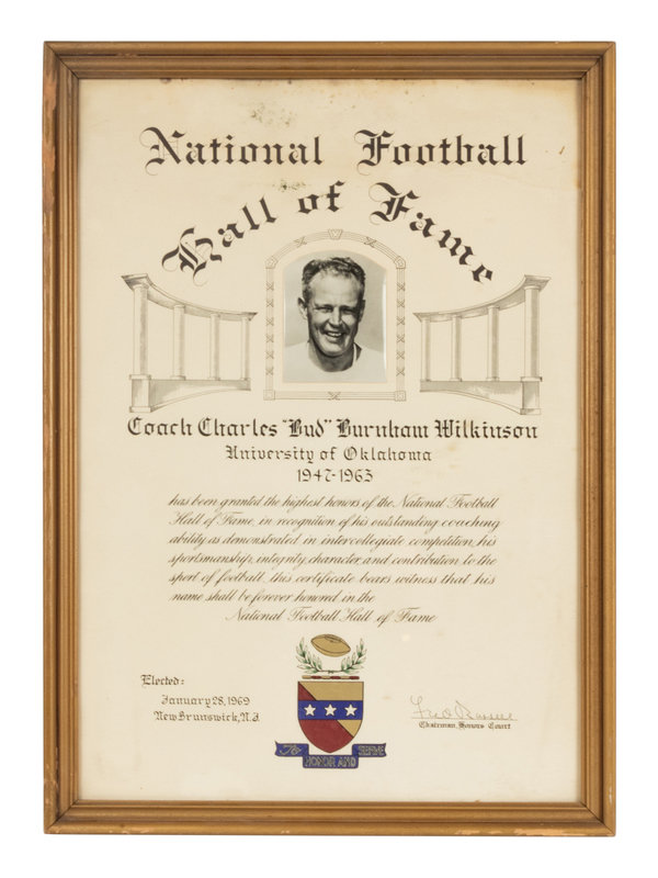 Over 17 seasons, Charles "Bud" Wilkinson led the Oklahoma Sooners to a record of 145-29-4 and three National Championships (1950, 1955 and 1956). In 1969 the National College Football Hall of Fame honored Wilkinson's achievements with election to the Hall of Fame. This award was presented to Wilkinson in recognition of his election and remained with him for the rest of his life. Framed.