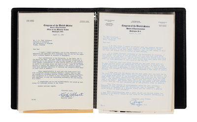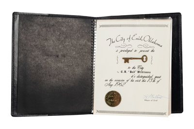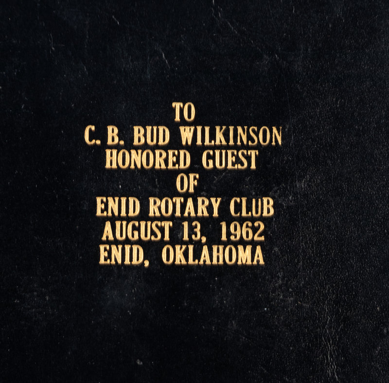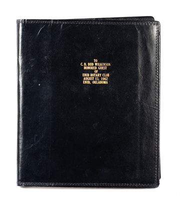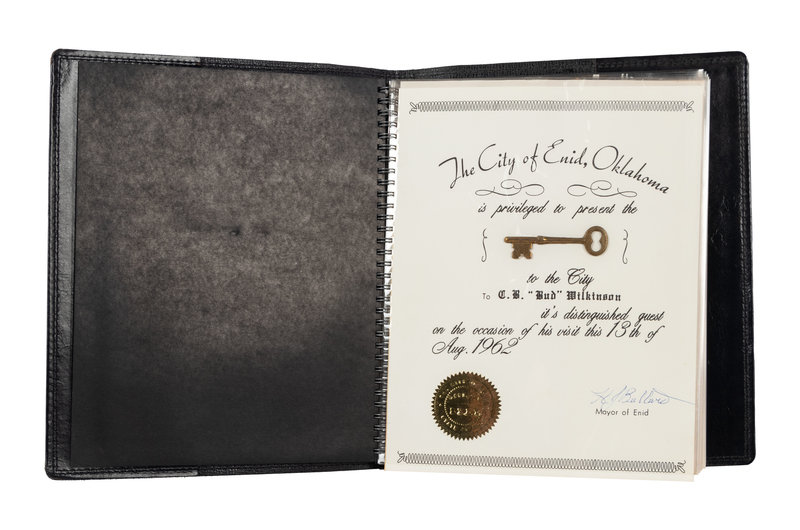 On August 13, 1962, the City of Enid, Oklahoma honored legendary Oklahoma University football coach Bud Wilkinson. To commemorate "Bud Wilkinson Day," Wilkinson was presented with a binder containing a key to the city, a telegram from President John F. Kennedy highlighting Wilkinson's "courage and integrity," letters of congratulations from those in the seats of United States power including Sen. Robert Kerr, Sen. Mike Monroney, Majority Leader Carl Albert, Rep. Page Belcher, Rep. Ed Edmondson, Rep. Tom Steed, Rep. Victor Wickersham. In addition to the well wishes, this historically significant binder contains photos from that memorable day in the extraordinary life of Wilkinson.