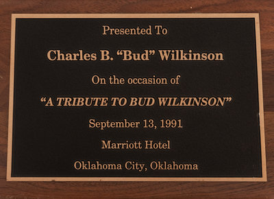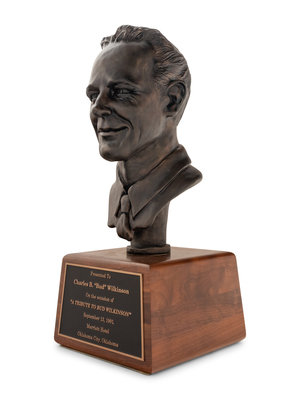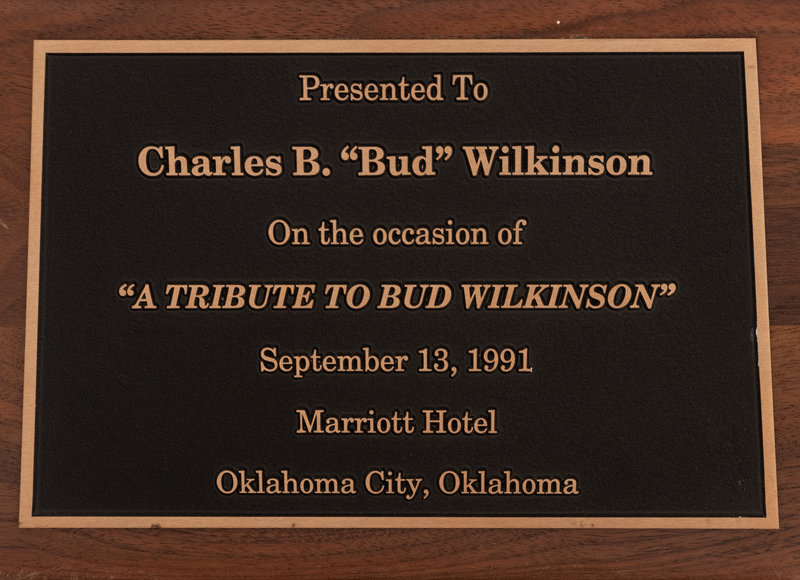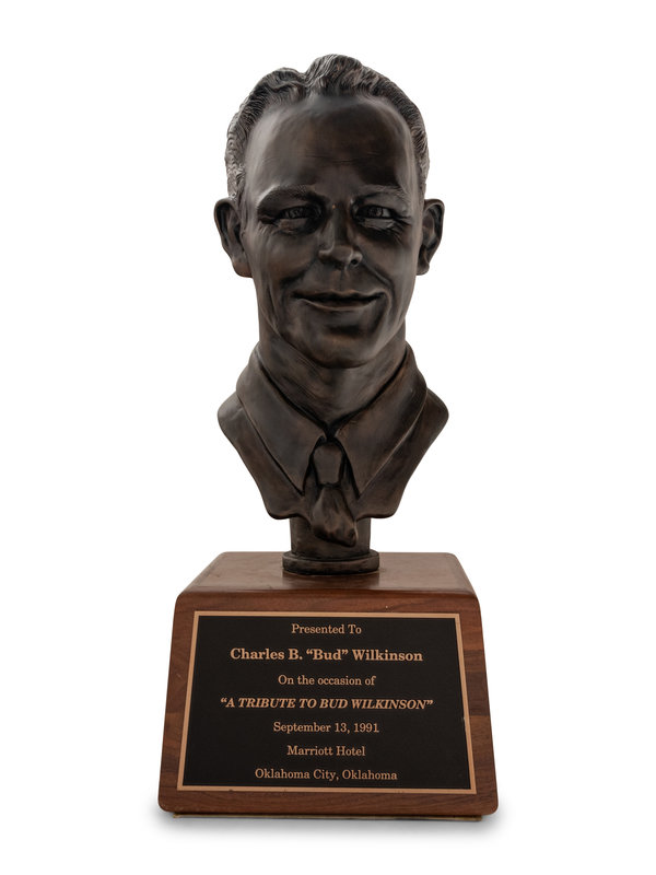 In 1991, legendary Oklahoma football coach Bud Wilkinson was honored with "A Tribute To Bud Wilkinson" event at the Marriott Hotel in Oklahoma City, Oklahoma. Many of Wilkinson's former Sooners players attended and he was later presented with this bust to commemorate the event. The striking trophy would stay with the coaching legend for the rest of his life.