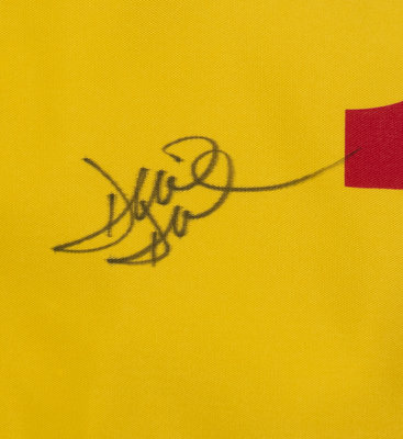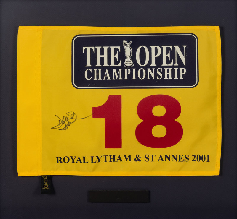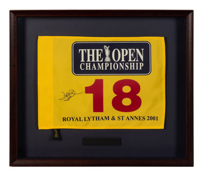 comprising a 2002 Masters flag signed by David Duval, Nick Faldo, Phil Mickelson, Scott Verplank, Lee Janzen, Ernie Els (31 1/4 x 22 inches); a framed 2004 Masters Phil Mickelson presentation (23 1/4 x 29 1/2 inches); a David Duval signed framed British Open flag (26 1/2 x 23 1/2 inches). Framed.