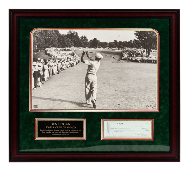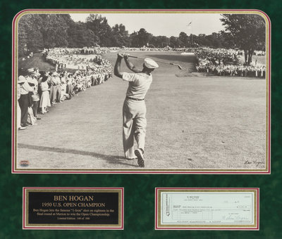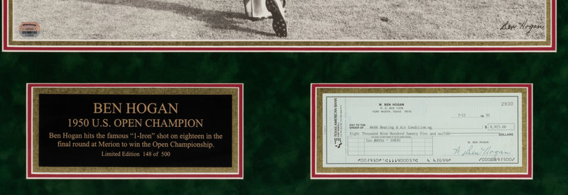 with iconic 1950 U.S. Open large photograph and 1991 check signed "W. Ben Hogan".