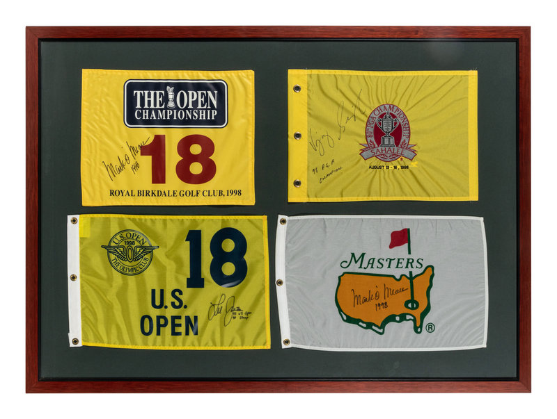 comprising one British Open flag signed by champion Mark O'Meara; one U.S. Open flag signed by champion Lee Janzen; one PGA Championship flag signed by champion Vijay Singh; one Masters flag signed by champion Mark O'Meara.