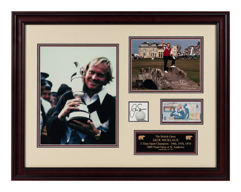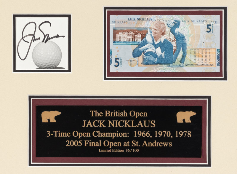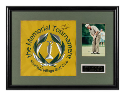comprising of a framed British Open display featuring one cut signature, two photos and an uncirculated 5 Pound Scotland Banknote (30 x 23 1/4 inches) and a framed Memorial Tournament display featuring a signed flag logo (23 1/2 x 18 inches).
