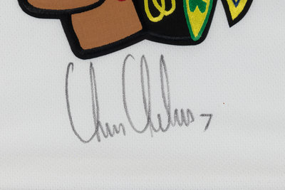 featuring Chris Chelios Charity Golf Classic patch and inscribed "Chris Chelios 7" in black.