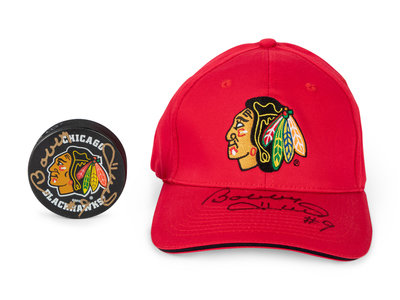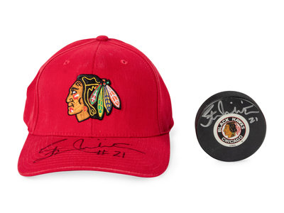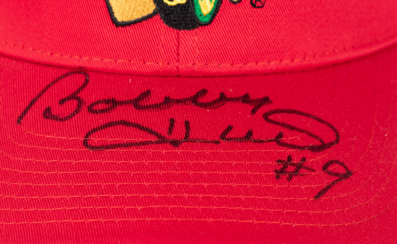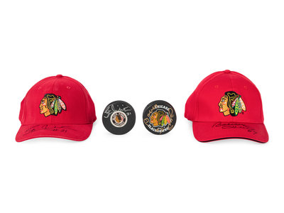 comprising a dual signed goalie hockey stick; a Stan Mikita signed hat and hockey puck; a Bobby Hull signed hat and hockey puck.