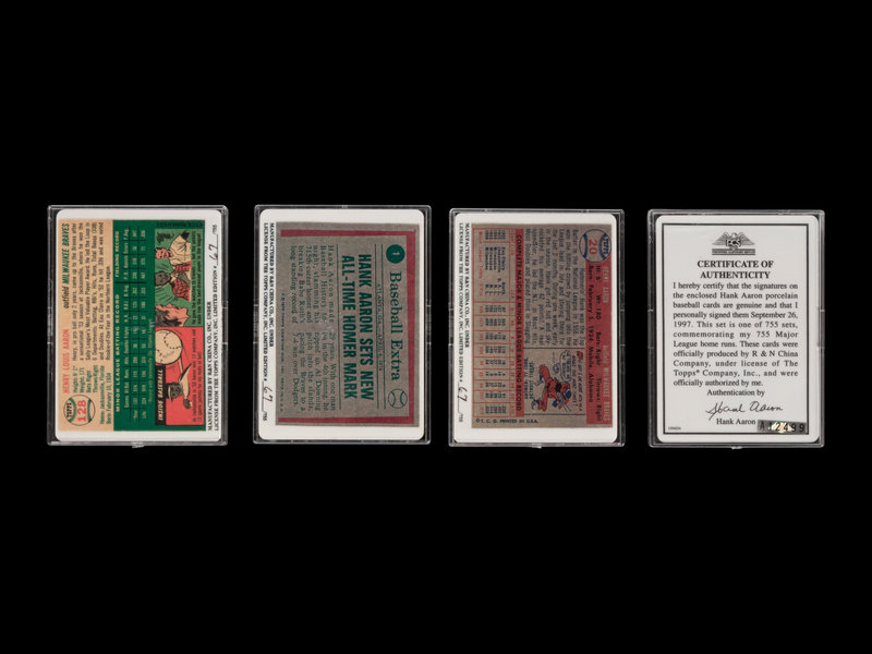 comprising porcelain issues of 1954 Topps inscribed "Hank Aaron HOF 82" in blue Sharpie; 1975 Topps inscribed "Hank Aaron 755 HR" in blue Sharpie; 1957 Topps inscribed "Hank Aaron 57 MVP" in blue Sharpie. All cards numbered 67 of 1,000.