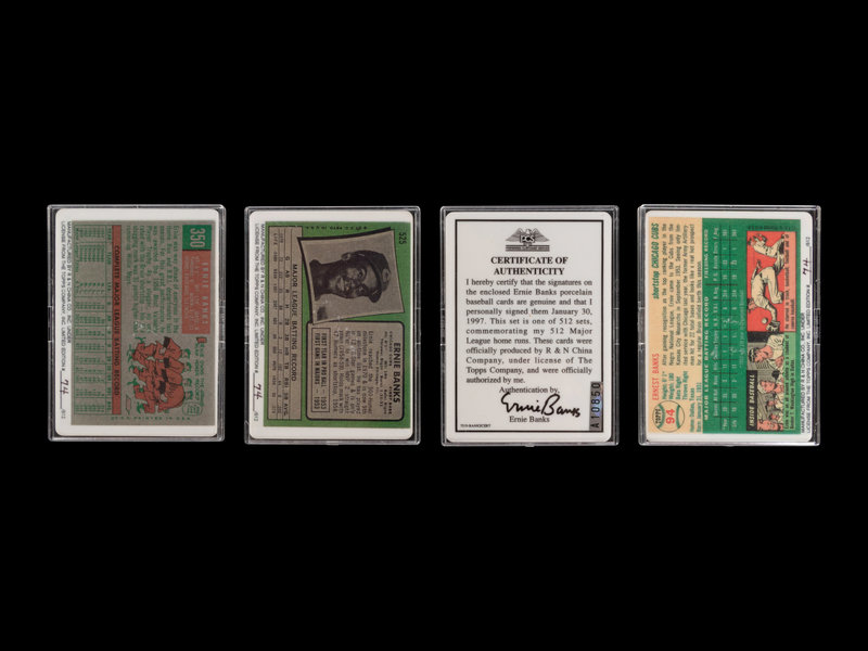 comprising porcelain issues of 1954 Topps (inscribed "Ernie Banks HOF 77" in black Sharpie); 1959 Topps (inscribed "Ernie Banks 58 59 MVP in blue Sharpie"); 1971 Topps (inscribed "Ernie Banks 512 HR" in black Sharpie). All cards numbered 74 of 512.