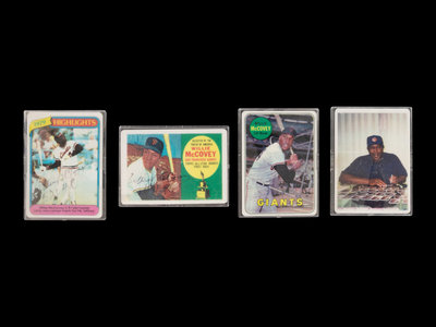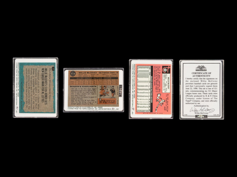 comprising porcelain issues of 1960 Topps (inscribed "Willie McCovey HOF 86" in black Sharpie); 1980 Topps (inscribed "Willie McCovey 521 HR); 1969 Topps (signature faded). All cards numbered 71 of 521.