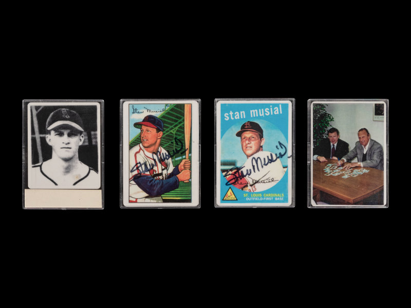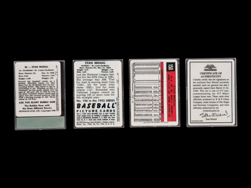 comprising porcelain issues of 1952 Bowman (inscribed "Stan Musial" in blue Sharpie); 1959 (inscribed "Stan Musial" in blue Sharpie); 1948 Bowman (unsigned). All cards numbered 78 of 475.