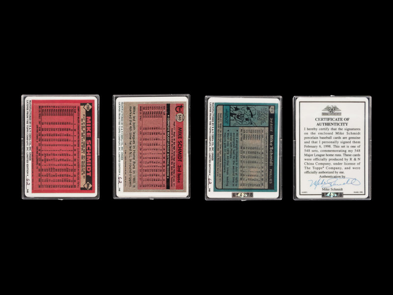 comprising porcelain issues of 1980 Topps (inscribed "Mike Schmidt HOF 95" in blue Sharpie); 1981 Topps (inscribed "Mike Schmidt MVP 80, 81, 86" in blue Sharpie); 1986 Topps (inscribed "Mike Schmidt 548 HR" in blue Sharpie). All cards numbered 62 of 548.