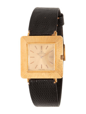 28.00 x 27.00 mm case dimensions, textured gold bezel, matte gold dial, applied gold baton numerals, jeweled manual wind movement signed JAEGER-LECOULTRE SWISS, black leather strap, gold-plated tang buckle with Jaeger-LeCoultre logo. 6 1/8-7 1/4 inches long.