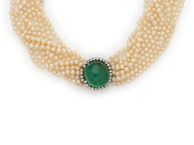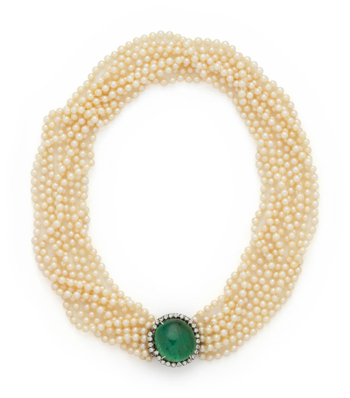 Consisting of nine strands of pearls measuring approximately 4.35-4.85 mm in diameter, strung knotted with a white gold clasp containing one oval emerald cabochon measuring approximately 27.00 x 24.00 mm and 28 round brilliant cut diamonds weighing approximately 1.65 carats total. 19-21 inches long.