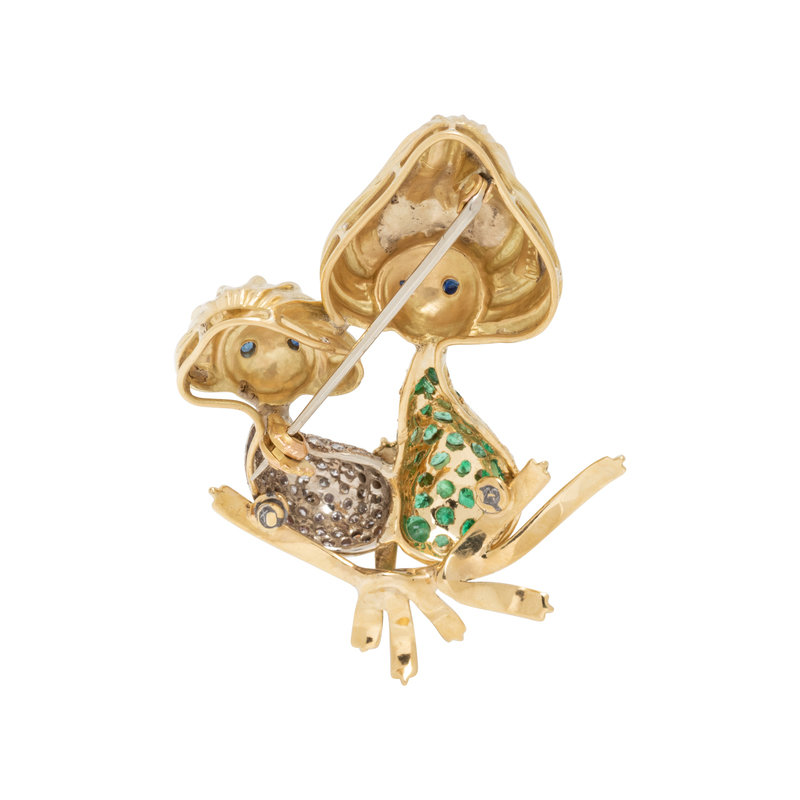 Containing numerous single cut diamonds, numerous round mixed cut emeralds and sapphire eyes. 1 7/8 x 1 1/4 inches.
