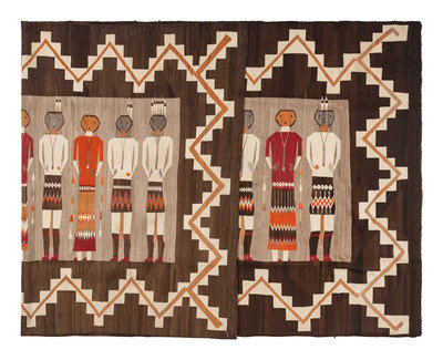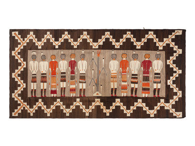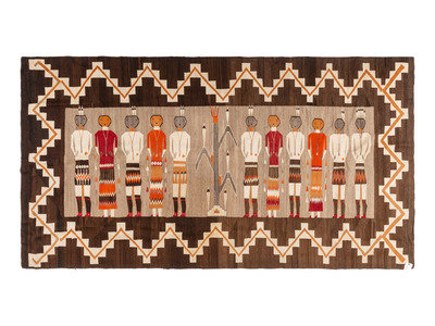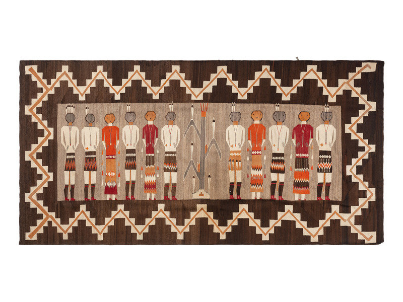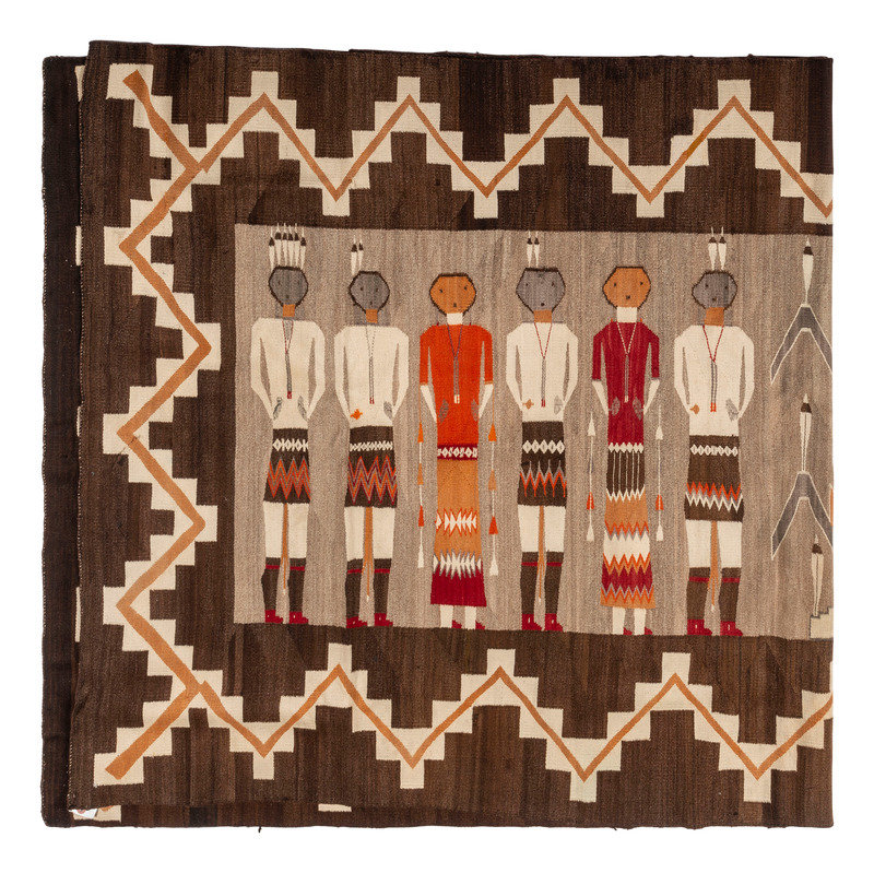 hand-spun wool woven in colors of red, orange, cream, browns, and gray; 11 figures are surrounded by a stepped, zigzag border