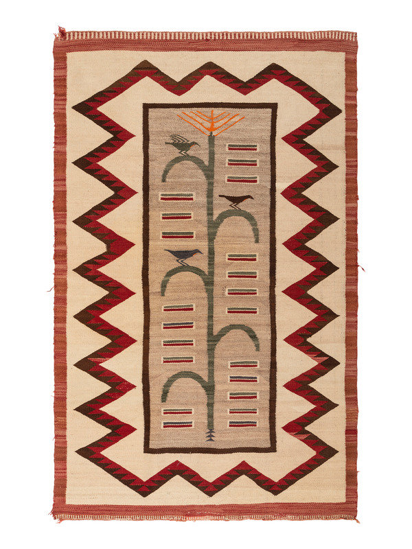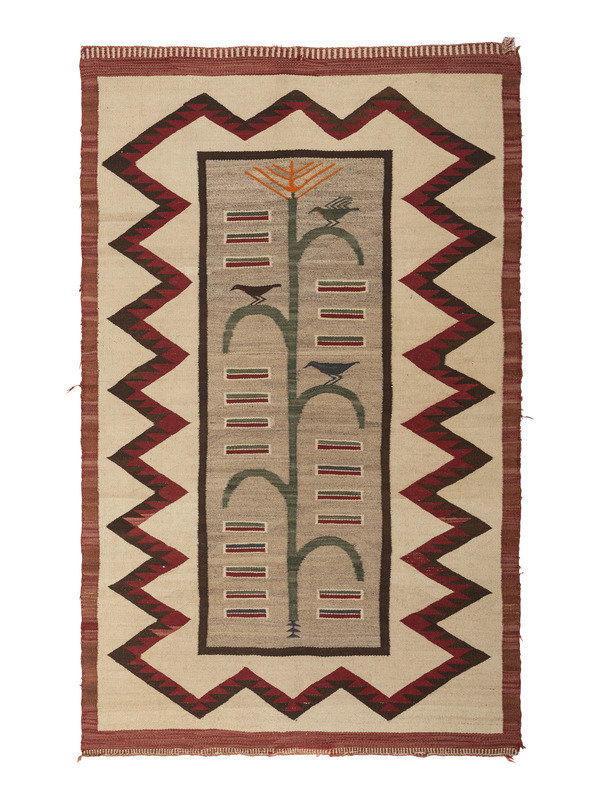 finely woven using colors of red, green, blue, cream, brown, gray, and orange; central design of a cornstalk with birds resting on the leaves