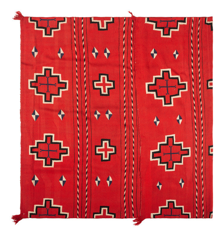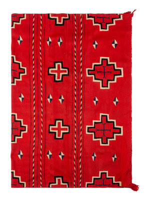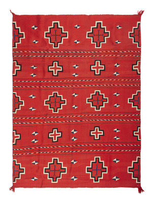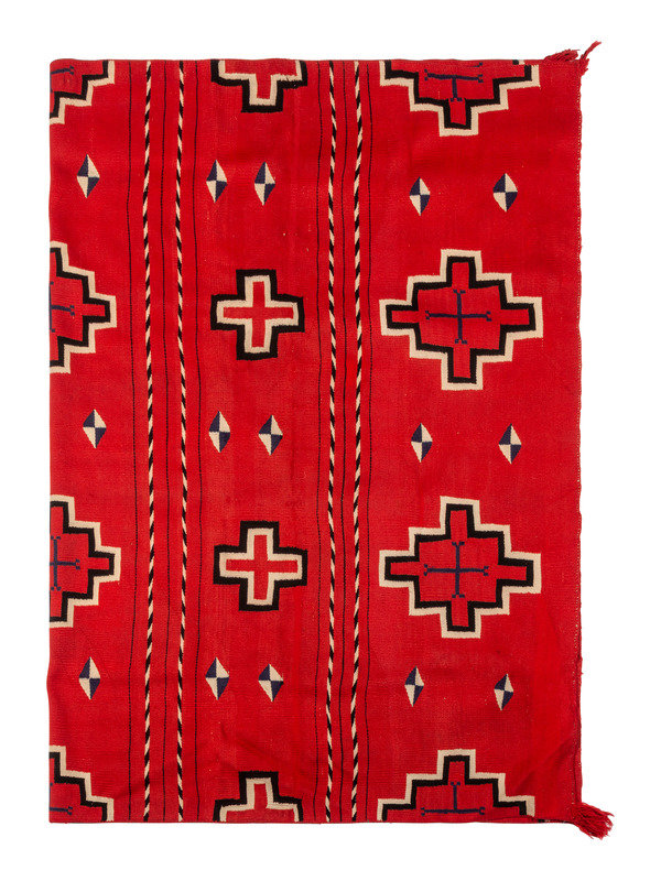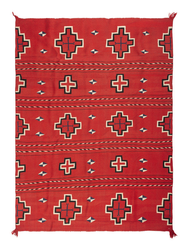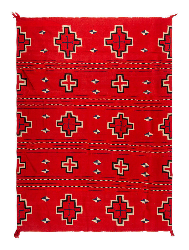 finely woven in colors of red, blue, cream, and black; with bands of Spiderwoman Crosses and "barber stripe" poles