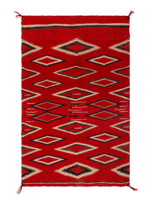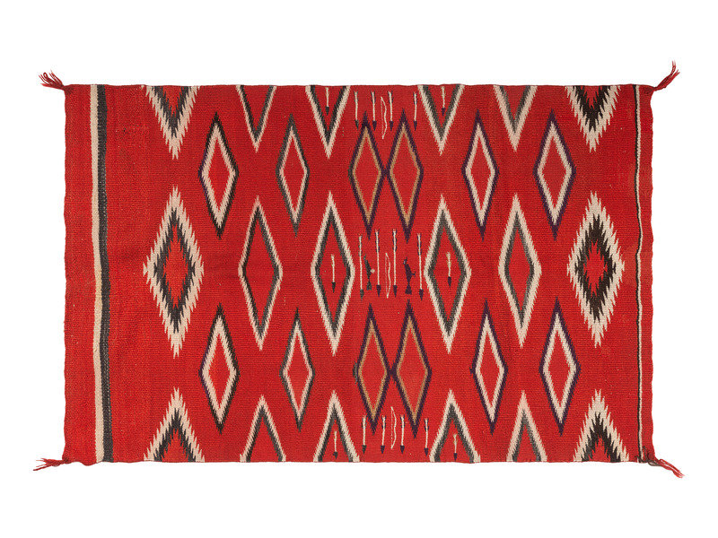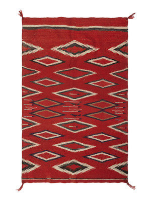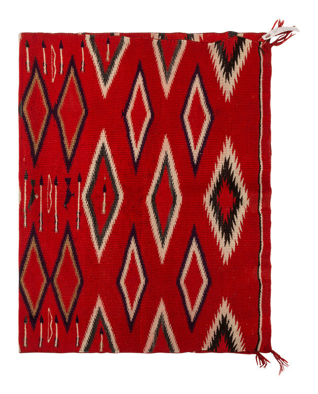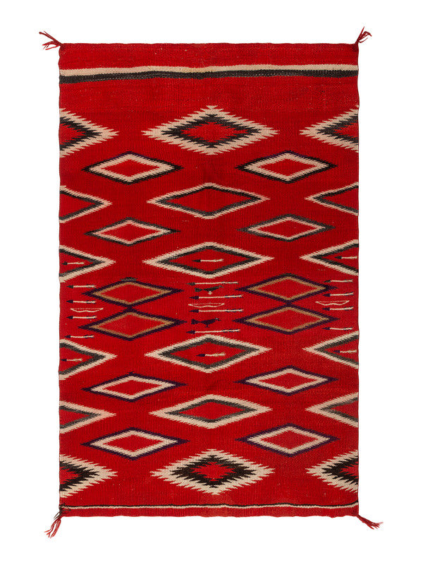woven using a combination of handspun and Germantown yarns in colors of cream, purple, gold, and overdyed black on a red field; in a pattern of varying serrated diamonds and arrows, bows, and birds