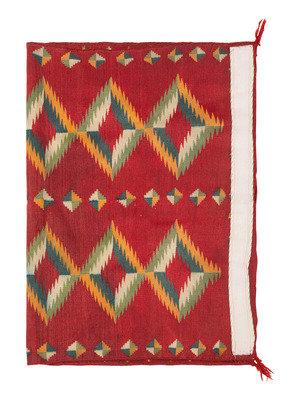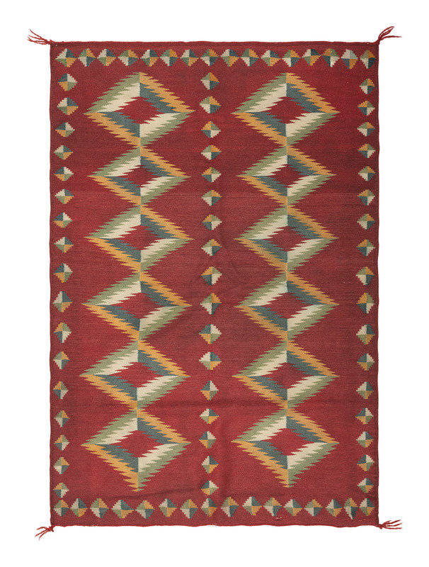 finely woven using colors of red, green, blue, cream, and orange; designed with stacked rows of serrated diamonds