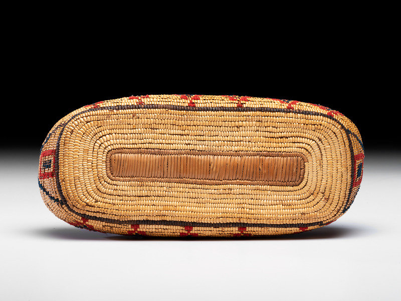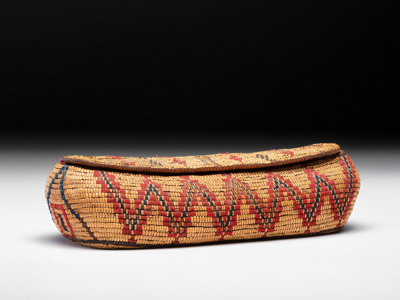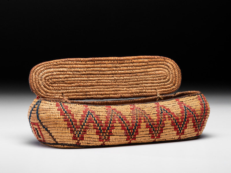 elongated, rectangular basket with hinged lid; zigzagging decorations executed using red and navy wool
