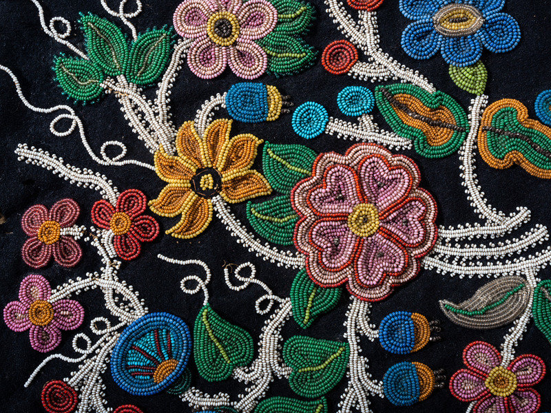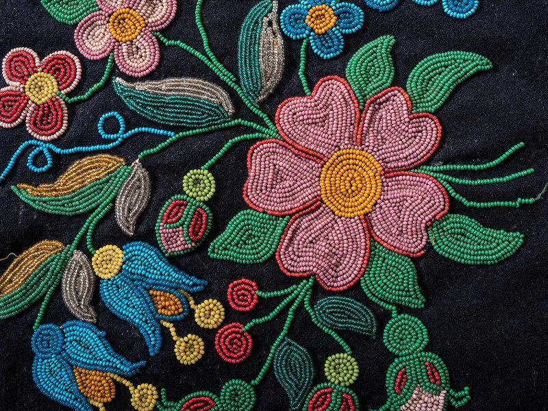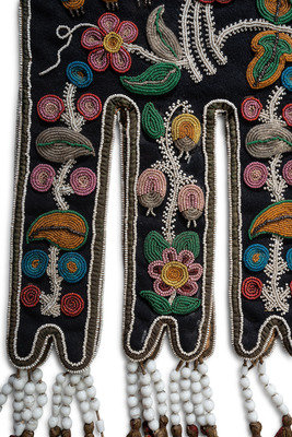 thread-sewn and beaded in a floral motif on blue trade cloth using shades of pink, blue, green, yellow, and white; having large white glass beads on yarn fringe