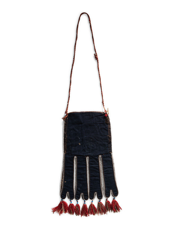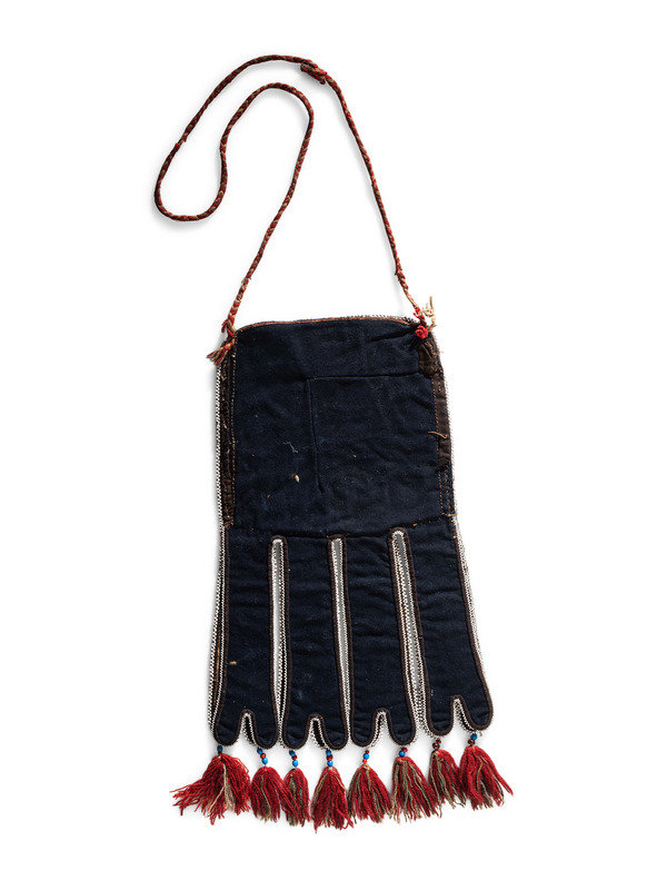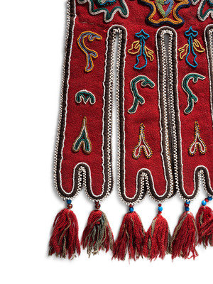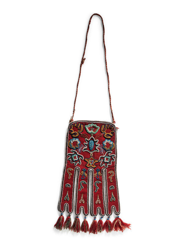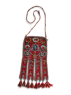 thread-sewn red and navy wool; decorated using a variety of colors and bead sizes; interior is lined with patterned cotton