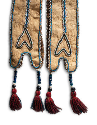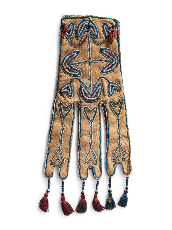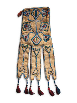 thread-sewn and beaded on both sides using colors of pony trader blue, red white-heart, eggplant, translucent green, and white; lined with patterned cotton