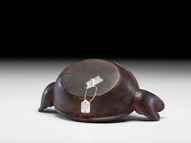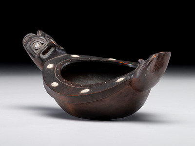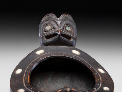 carved with two facing eagle heads having abalone shell eyes; rim of bowl with eight bone insets