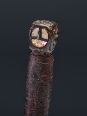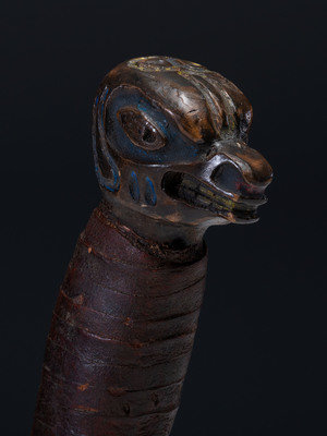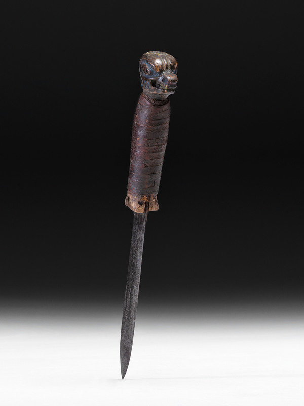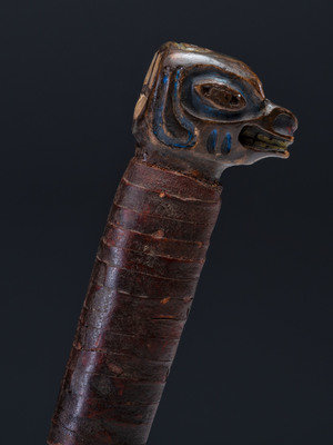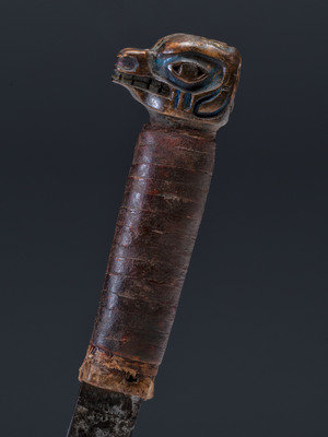 pommel carved in the form of a bear and enhanced with blue and yellow pigments; abalone shell insets; oil cloth wrapped grip; steel blade
