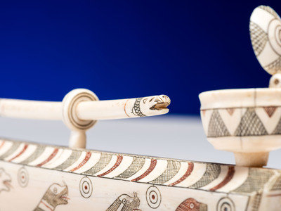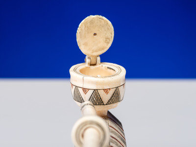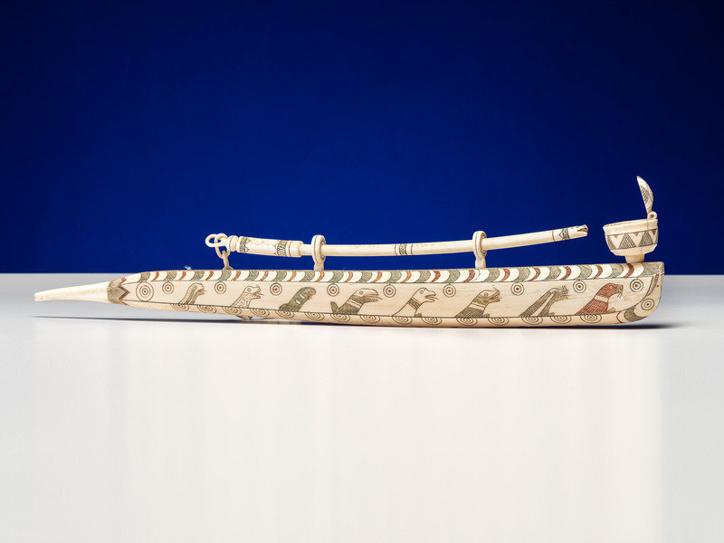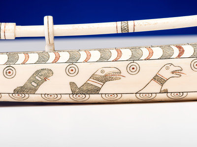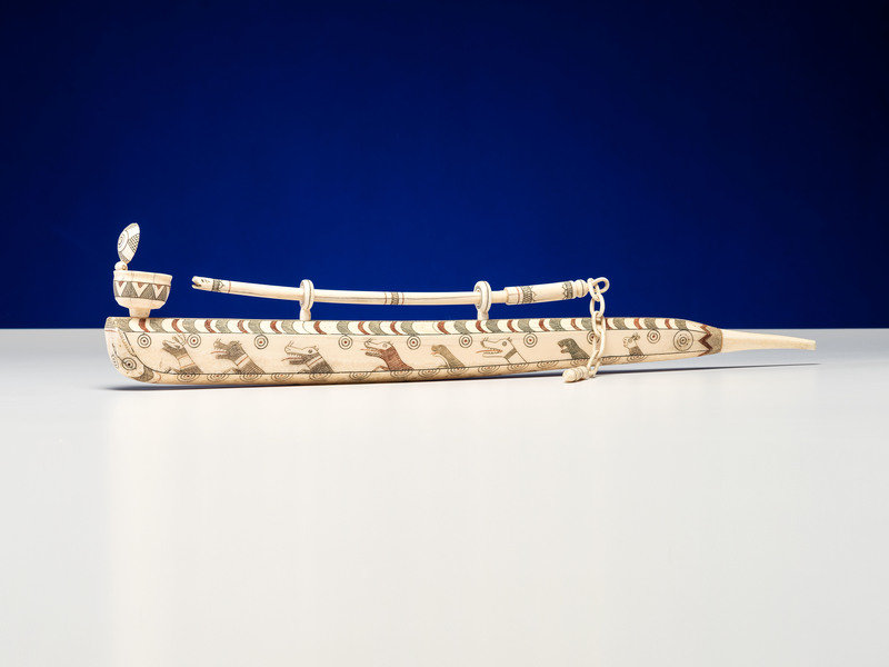 caribou, wolves, seals, walrus, and other amphibious creatures in red and black decorate sides of pipe; separately carved pipe bowl has hinged lid; pipe tamper is in the form of a seal and terminates with chain link