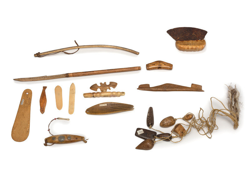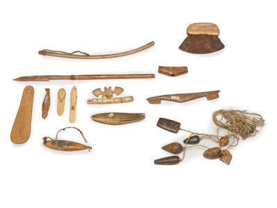 includes a bird bola, pump drill handle and unassociated mouthpiece, netting tool, harpoon point, and weighted lure
