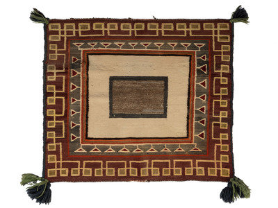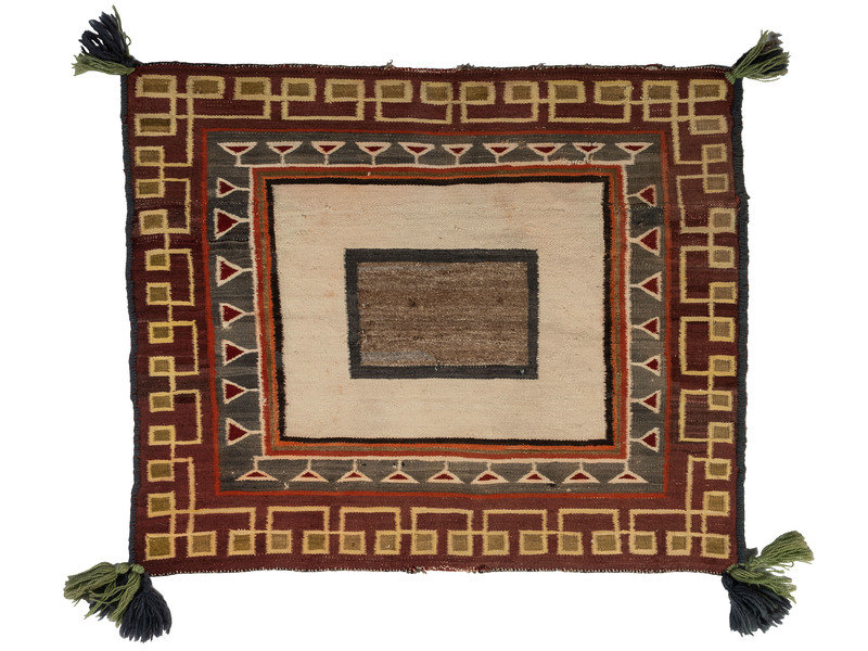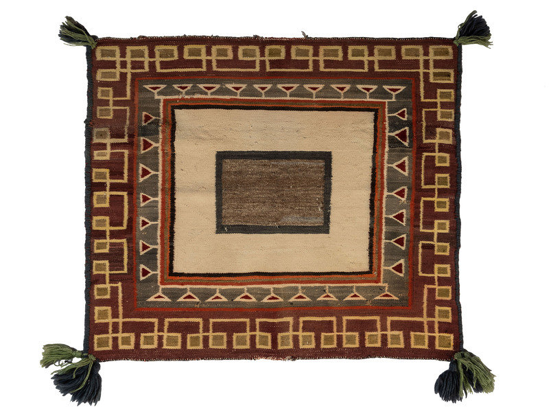 hand-spun wool woven with a nesting border designed in colors of red, orange, green, blue, cream, and brown