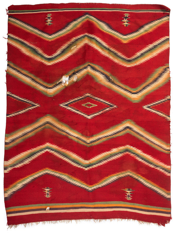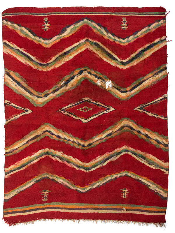 woven in red, cream, blue, green, and orange with a serrated zigzagging pattern