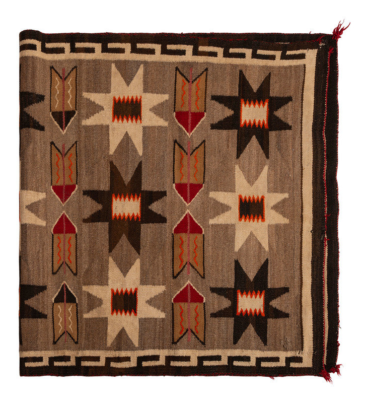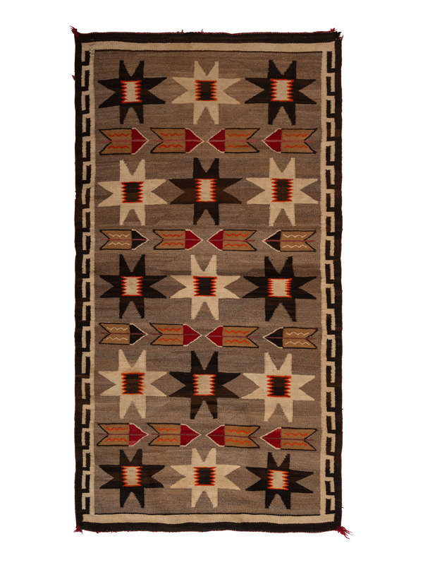 woven using a natural palette accented with orange and red; designed with fifteen valero stars and sixteen feathers; Greek key border on two sides