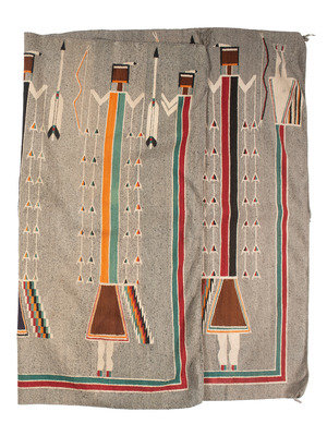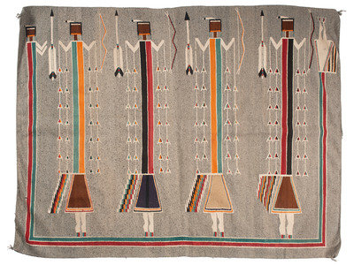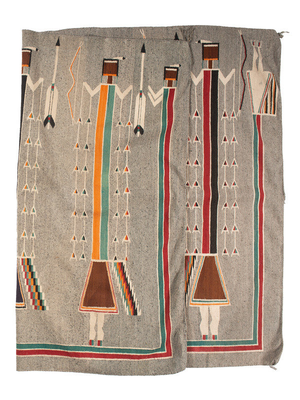 hand-spun wool woven in colors of red, purple, green, orange, gray, and tan; four Yei are surrounded by a Rainbow Guardian