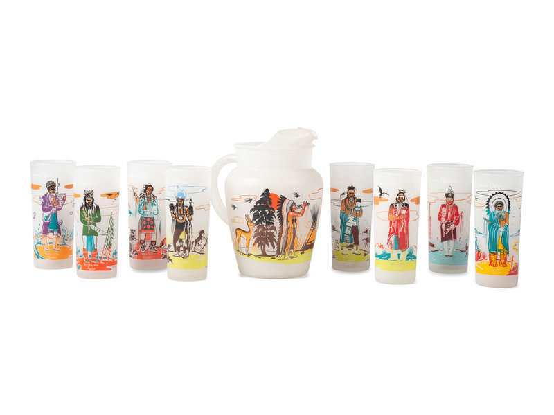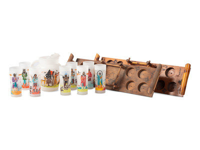 Blue Eagle designed glass and pitcher set with two custom wood trays