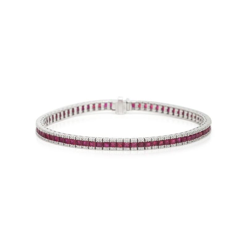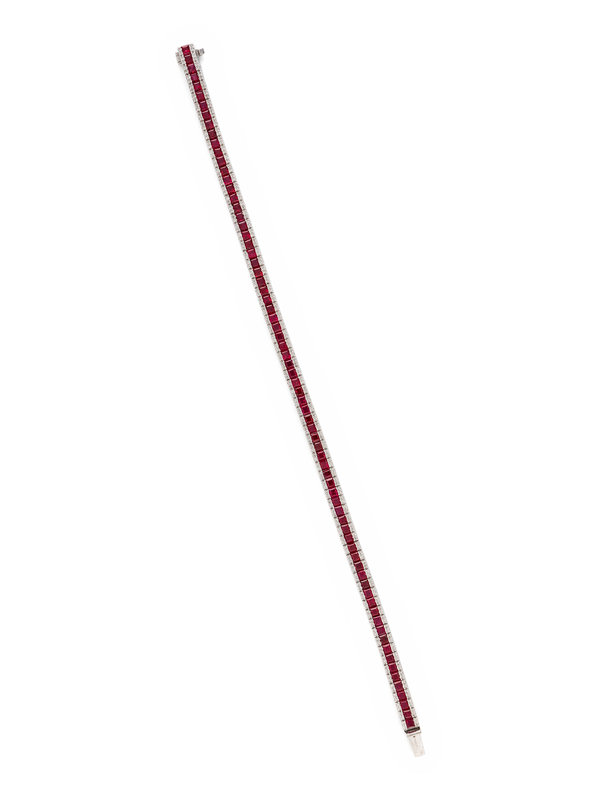 Containing 74 square step cut rubies and numerous round brilliant cut diamonds weighing approximately 0.60 carat total. Mounted in white gold. 7 inches long.