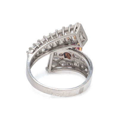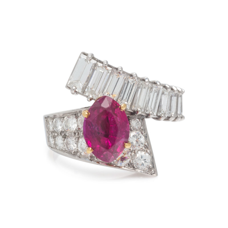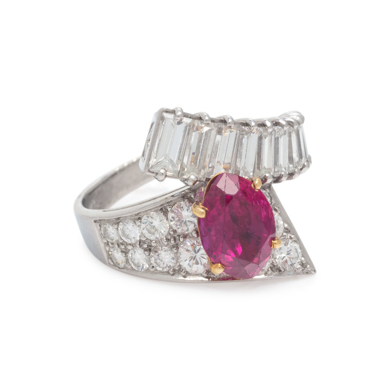 Containing one marquise cut ruby measuring approximately 9.65 x 6.55 x 4.70 mm, 15 round brilliant and 10 baguette cut diamonds weighing approximately 1.95 carats total. Mounted in platinum. Ring size 7 1/4.