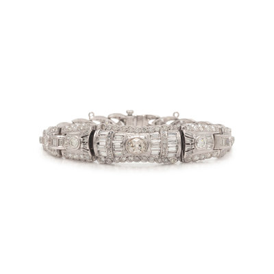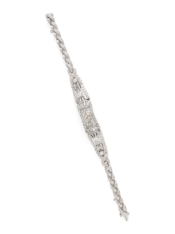 Containing one oval shaped old mine cut diamond weighing approximately 1.20 carats, four round brilliant and numerous baguette and single cut diamonds weighing approximately 5.25 carats total. Mounted in platinum. 6 3/4 inches long.